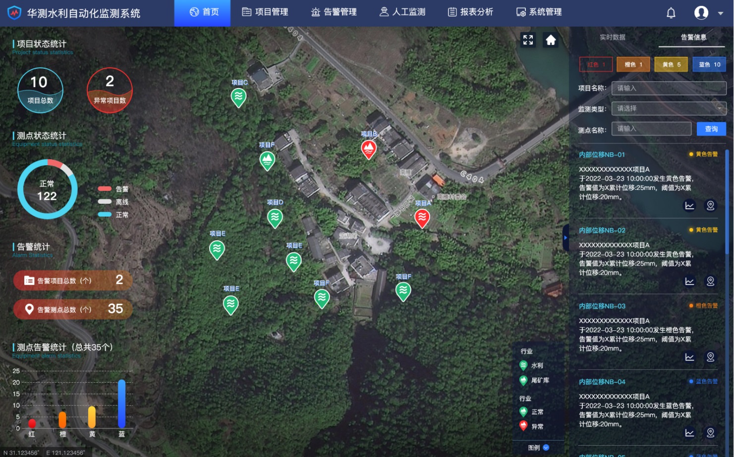 華測水庫雨水情測報和大壩安全監測預警系統包含大壩三維展示、項目管理、綜合監測、報表分析、系統設置等模塊;支持視頻、雨量、表面位移、庫水位、滲流壓力、滲流量等常用監測類型;具備水位庫容曲線、特征水位展示、浸潤線剖面等水利行業功能。